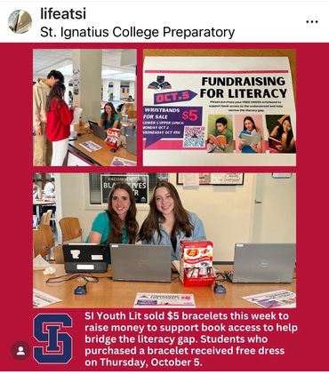 YLIL & SI Raise $1500 for Literacy Youth Leaders in LIT: Advocates for Literature & Literacy led a two day fundraiser to bring awareness to closing the literacy gap. St. Ignatius College Preparatory Students raised $1500 which was donated to the Children’s Book Project in San Francisco to aid in their mission to provide books to the underserved in the Bay Area. VIDEO HERE