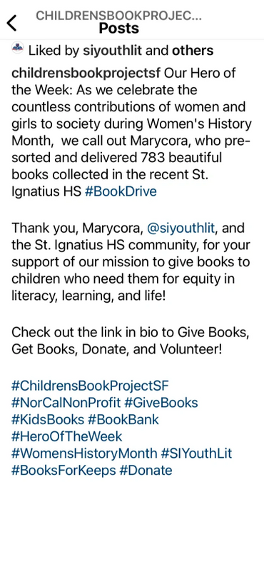 Thank you, Marycora, @siyouthlit, and the St. Ignatius HS community, for your support of our mission to give books to children